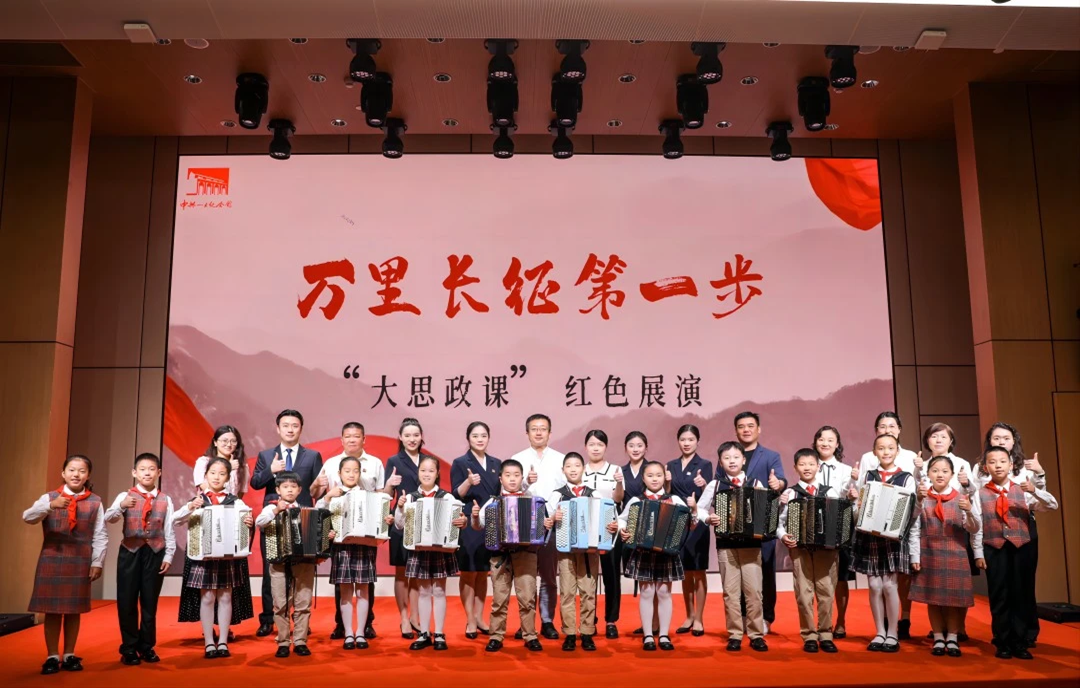 活动中,上海师范大学附属嘉定小学的同学们,为大家带来手风琴演奏中共一大纪念馆馆歌《初光》、红歌《闪闪的红星》以及诗朗诵《长征路上》等精彩文化交流节目。