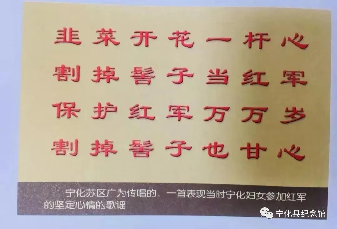 (另一版本:韭菜开花一杆心,剪掉髻子当红军。保佑涯红军万万年,妇女解放真开心。)